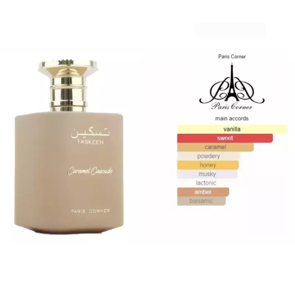 Taskeen Caramel Cascade de PARIS CORNER es una fragancia de la familia olfativa Floral Frutal Gourmand para Hombres y Mujeres.